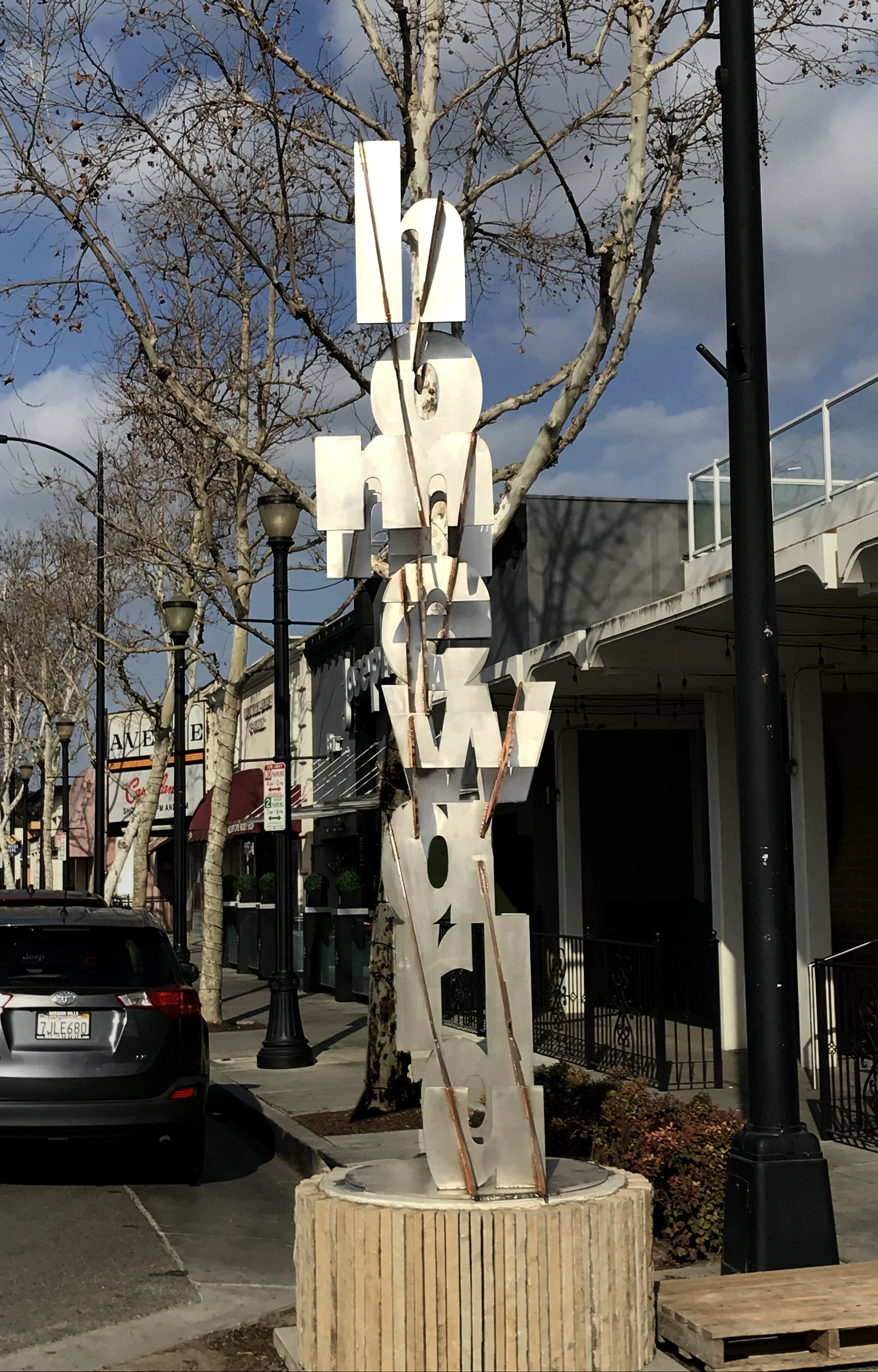 It is 14’ tall and made of stainless steel plates.